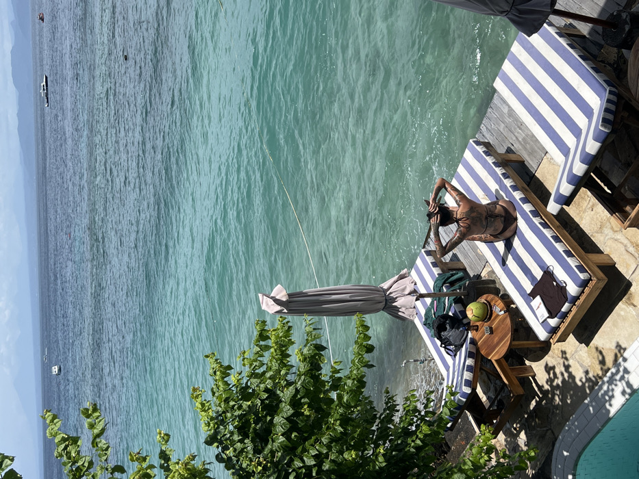 The image depicts an elevated view of a coastal leisure area in Batununggul, Indonesia, overlooking clear ocean waters. In the foreground, a person is seated on a wooden sun lounger with a blue and white striped cushion, facing away from the viewer towards the ocean. The individual is wearing a dark two-piece swimsuit and exhibits extensive dark tattoos covering their back and arms. Their hands are raised to the back of their head, appearing to adjust or secure their hair. To the left of the seated individual, a second sun lounger with a matching cushion holds a black backpack and a folded green garment. Between these two loungers is a small, round wooden side table. On the table, a green coconut with a straw is visible alongside several small, dark, disc-shaped objects. A dark, folded piece of clothing rests on the lounger occupied by the person. A folded grey beach umbrella is positioned behind the lounger holding the bag. Another folded grey umbrella is partially visible on the far right. Below the deck on the lower left, a portion of a light blue swimming pool is visible. Lush green foliage frames the scene from the upper left. The immediate water is a light turquoise, transitioning to a deeper blue further from the shore. A white rope or line floats on the surface of the water, running horizontally across the mid-ground. In the distance, several white boats are visible on the water, and a hazy landmass with mountains outlines the horizon under a bright sky. The overall scene suggests a sunny day at a seaside resort.