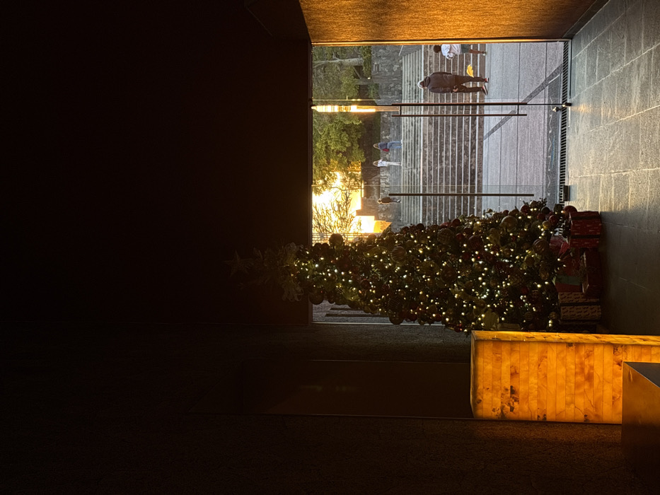 A Christmas tree illuminated with warm lights stands indoors, near a sunlit staircase viewed through an opening. People are walking up the steps outside. The tree is adorned with ornaments and surrounded by wrapped presents. A rectangular, light-emitting structure sits near the tree, casting a soft glow. The surrounding indoor area is dimly lit, contrasting with the bright outdoor scene.