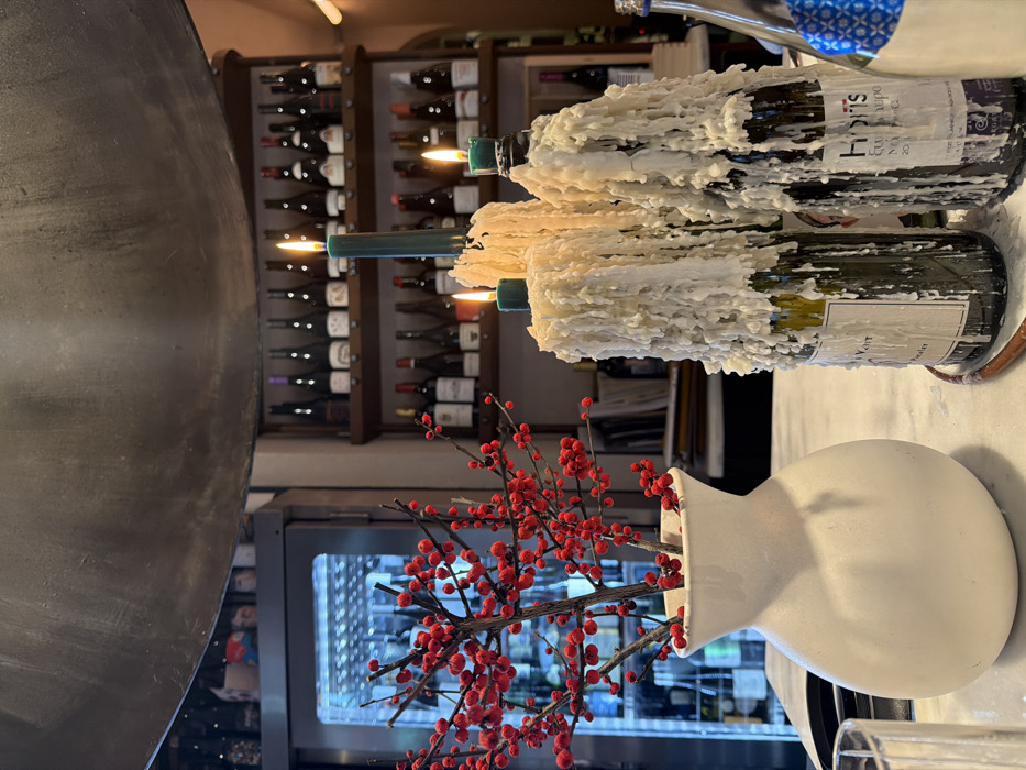 The image depicts an interior scene, likely a restaurant or wine bar, located in the city of London, United Kingdom. On a light-colored counter in the foreground, a white, bulbous ceramic vase holds branches densely covered with small, red berries. To its right, three dark glass wine bottles, heavily encrusted with white dripped candle wax, serve as candle holders; each contains a green taper candle, with two actively burning. Visible labels on these bottles include 'DOMAINE 'LA', 'Vincent Piccard', and 'HORIS Ερυθρο'. A clear glass is partially visible on the far left. In the background, a tall, stainless steel refrigerated display unit, illuminated with blue light, contains numerous bottles. Adjacent to this, two wooden shelves are mounted on a wall, showcasing rows of various wine bottles. A large, inverted metallic dome fixture hangs from the ceiling, partially visible at the top of the frame. No individuals are present in the scene.