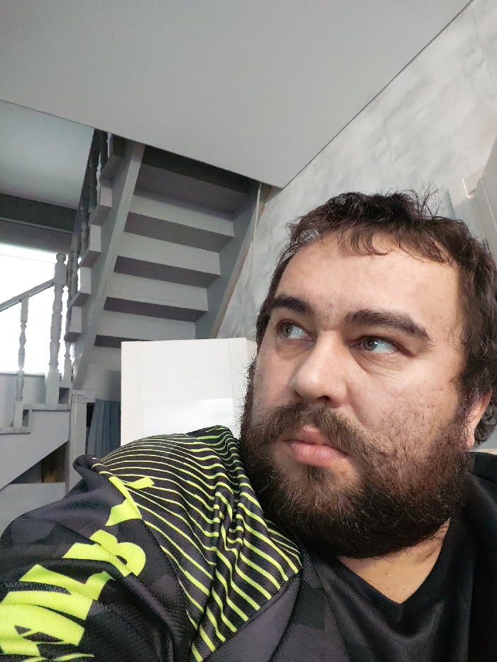 A close-up photograph depicts an adult male within an indoor setting. The male subject has dark, curly hair, a full dark beard, and blue-green eyes directed upwards and to the viewer's left. He wears a black V-neck shirt underneath a dark garment featuring neon green wavy stripes and solid patterns on the right shoulder and upper chest area. In the background, a light-toned wooden staircase with a turned balustrade ascends towards the left, adjacent to a window emitting diffused light. A white panel, consistent with a door or cabinet, is positioned to the right of the staircase. The wall behind the subject exhibits a light gray, textured finish, and the ceiling is white. The scene is situated in the city of Unknown, Unknown.