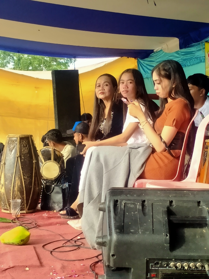 The scene depicts an outdoor or semi-outdoor gathering in Ganten, Indonesia, under a blue and white striped canopy and a yellow tarp structure. The ground is covered with a red carpet, scattered with pink flower petals. In the foreground, three adult females are seated. From left to right: An older woman with long dark hair, wearing a black top with white embroidery and earrings, looks towards the viewer. Next to her, a younger female with long dark hair, wearing a white t-shirt and light grey sweatpants draped over her lap, holds a mobile phone and looks towards the viewer. To her right, another younger female with long dark hair, wearing an orange ribbed short-sleeved top and a dark waistband, is seated on a pink plastic chair, looking down at a mobile phone. In the mid-ground, to the left, two traditional Indonesian drums (kendang) are visible on the red carpet: a larger, dark carved drum and a smaller drum with a light-colored head. A clear plastic cup, a green-yellow mango, and coiled black cables are also on the carpet. A black bag rests near the smaller drum. Behind the drums and the seated females, several other individuals are partially visible, including a person in a blue baseball cap and another in a white collared shirt. A large, dark audio speaker stands in the mid-left background, and a worn black audio speaker box with visible controls is present in the front right foreground. Green foliage is visible beyond the tent structure in the far background.
