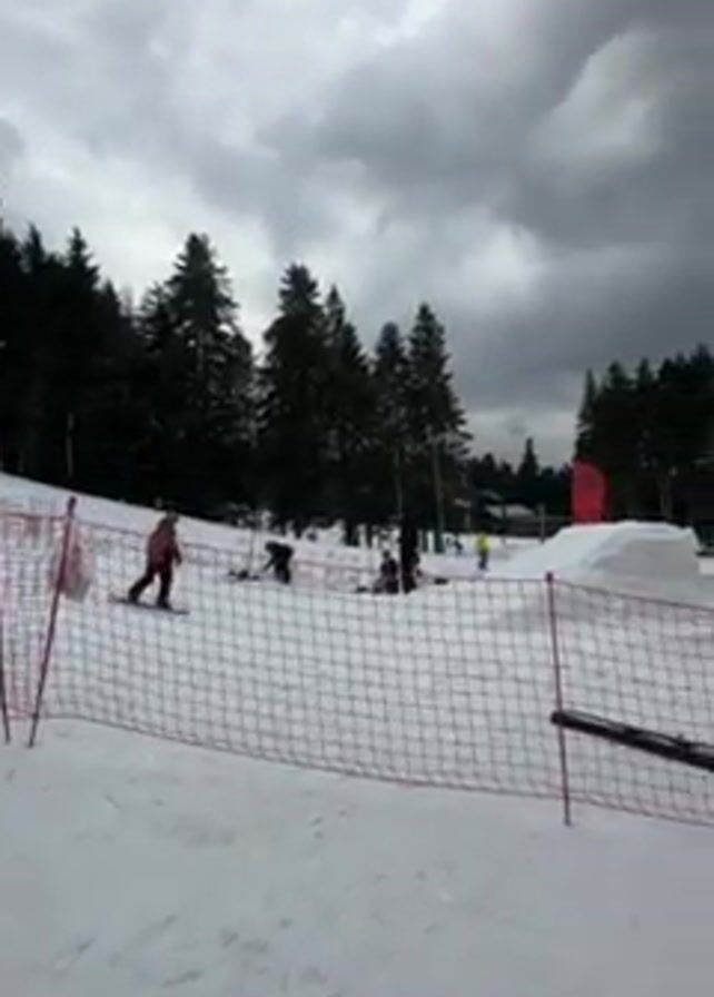 ski park on a cloudy day. The ground is covered in snow and there are several people skiing and snowboarding. In the foreground, there is a safety net. Behind the net, there is a small jump and a large inflatable landing pad. There are red flags with white lettering visible. Trees are visible in the background.