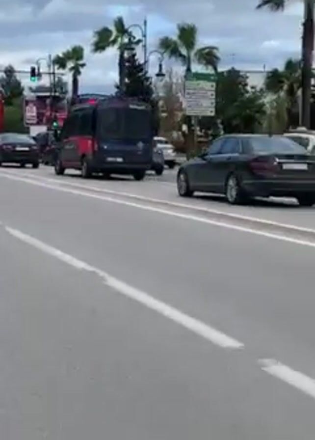 multi-lane road with moving traffic under a partly cloudy sky. Various vehicles, including a red bus, black Mercedes-Benz, black van, white taxi, and a green hatchback, are seen driving on the road. Palm trees and other trees line the side of the road. A tall lamppost is visible in the background.