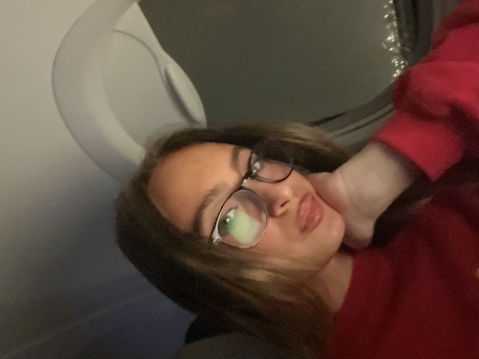 young female inside an aircraft at night. The subject, positioned centrally, has long brown hair with lighter highlights and wears clear-framed glasses. She is dressed in a red long-sleeved garment, possibly a sweater or sweatshirt. Her chin rests on her left hand, and her lips are slightly puckered in a "duck face" expression as she looks directly towards the camera. A light source reflects prominently in her glasses. To the right, an aircraft window reveals blurred, distant city lights against a dark night sky, indicating the plane is airborne or on the ground at an airport. Above and behind her on the right, a curved white or light-grey panel, characteristic of an aircraft interior ceiling or wall, is visible. The immediate ground location, such as Sdot Dan Regional Council, Israel, cannot be determined from the visual information provided in the image.