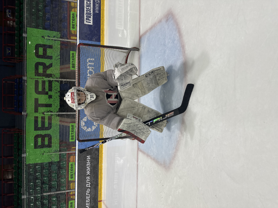 A hockey goalie stands ready in the net. The goalie wears a white helmet, gray pads labeled “CCM” and “BAUER,” and a gray jersey with a team logo on the chest. A black hockey stick labeled “TRUE” rests to the right of the goalie. Green and blue advertisements line the rink’s boards, reading "BETERA" and "ГРОДЗЕНСК". The ice is clean and reflects the overhead lighting. Empty green seats are visible in the background.