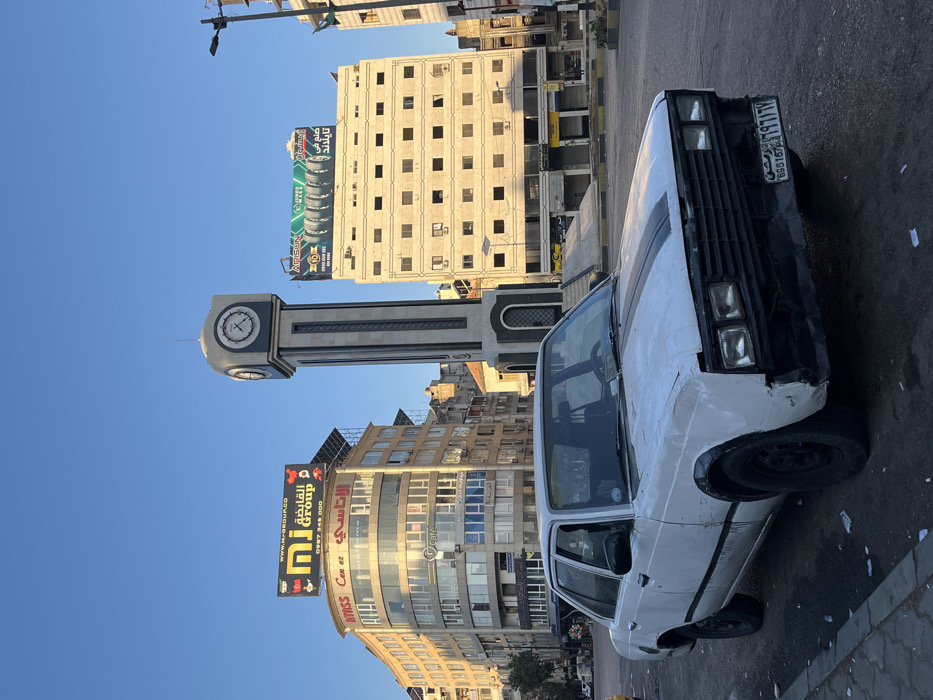 The image displays a street scene in Homs, Syria, specifically centered around the Clock Tower in Sa'a Square