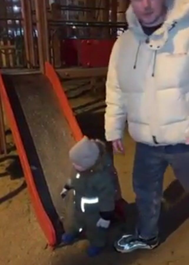 toddler in a gray hat and dark green winter outfit standing at the bottom of a red and gray slide on a playground. A man in a white puffy jacket and jeans stands next to the slide. He looks down at the child. The camera then pans up to show a street light and a tall apartment building in the background. It is snowing. The toddler makes sounds, possibly crying.
