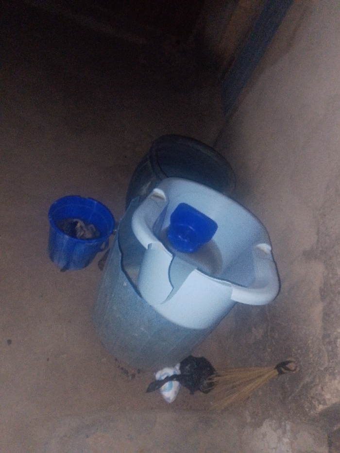 A dimly lit room contains several buckets. A light blue bucket is cracked and has a smaller blue bucket inside. Another black bucket sits behind the light blue one. To the left is a small blue bucket with an indiscernible object inside. At the bottom of the frame, a broom lies next to some trash. The room appears to be a storage area.