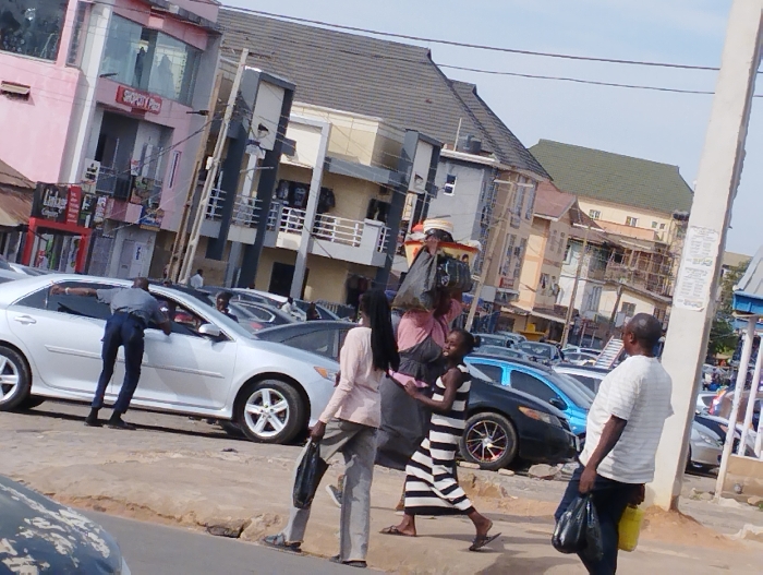 This image captures an urban street scene in Jos, Nigeria, under a clear, bright sky. In the foreground to the left, a silver Toyota Camry sedan is parked at an angle, with its driver's side front door open. A male individual, wearing a dark blue/grey uniform, leans into the open car window, interacting with an occupant in the driver's seat whose head is partially visible. Behind the Camry, other vehicles are parked. Further left, a multi-story pink building with visible commercial signs, including "SHOPON P**" and "Linkage ***", stands adjacent to the street. On the right side of the midground, several pedestrians walk along an unpaved shoulder next to the road. A woman, dressed in a pink top and dark skirt, carries a large, light-colored object topped with a black plastic bag on her head. Beside her, a young girl in a black and white striped dress walks towards the right. Further right, a man in a white striped polo shirt and dark trousers walks right, holding a black plastic bag in his left hand and a yellow jerrycan in his right hand. A concrete utility pole, with some notices attached, is positioned on the far right. The background features a street lined with multiple multi-story buildings of varying architectural styles and colors, including grey, beige, and structures with brown roofs. Some buildings display balconies and visible scaffolding, suggesting active construction or renovation. Numerous vehicles are parked along the street.