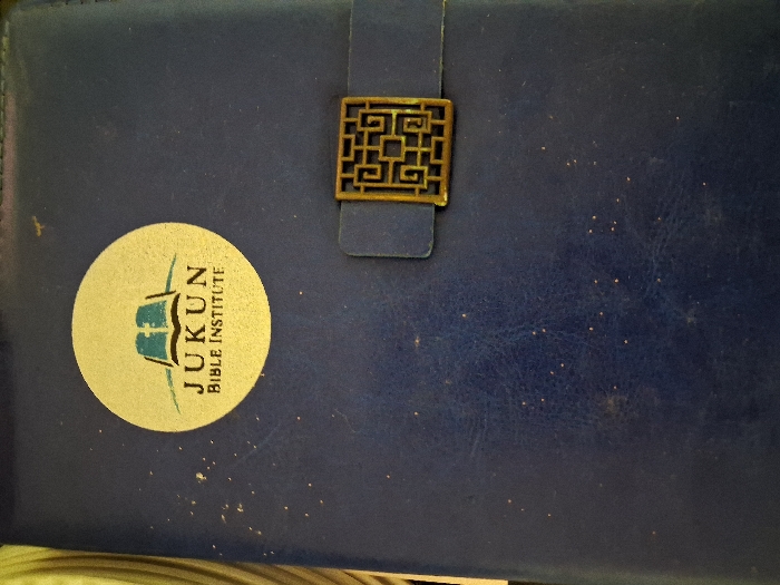 A dark blue, leather-bound object, likely a book or journal, is presented in a top-down view. A circular, light gold decal or sticker, approximately 7 cm in diameter, is affixed to the upper left quadrant. This decal features an open book icon in teal with a cross symbol above it, beneath which the text "JUKUN BIBLE INSTITUTE" is printed in dark teal. A narrow, dark blue strap extends from the right edge towards the center, secured by an ornate, brass-colored rectangular clasp with an intricate geometric, maze-like design. The blue surface of the object exhibits minor scuffs, faint scratches, and scattered small white particulate matter. A blurry, light-colored, vertically striped object is partially visible along the extreme left edge. The object is located in the city of Howayi, Nigeria.