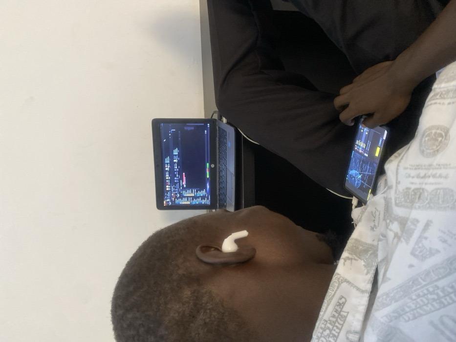 An individual is depicted in an indoor setting within the city of Narayi, Nigeria. The subject, viewed from the upper back and right side, is male, with short dark hair, and has a white wireless earbud inserted into their right ear. They are wearing a light-colored, short-sleeved collared shirt patterned with US dollar bills and dark athletic pants with a white side stripe. An open HP laptop is positioned on a dark surface in front of the individual, displaying what appears to be code or a terminal interface with multi-colored text on a dark background. A smartphone rests on the subject's lap, with their right hand interacting with its screen, which exhibits a graphical interface featuring circular elements, possibly related to data visualization or a trading application. A white cable is connected to the smartphone. The background consists of a plain, light-colored wall exhibiting minor surface discolorations.