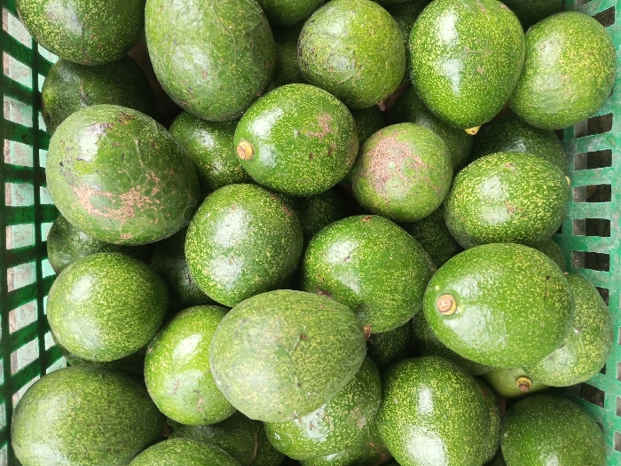 A close-up shot reveals a multitude of green avocados, densely packed together within a green container