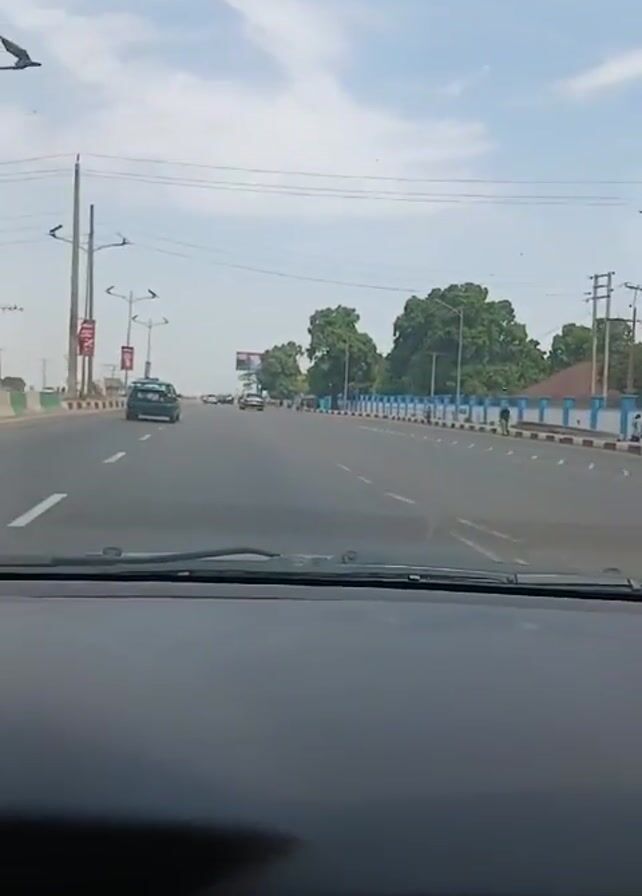 car driving down a multi-lane road on a partially cloudy day. There are a few other cars on the road, and trees line the side of the road. There are also light poles and signs along the road. A gray car passes on the right side. The video is shot from the perspective of the driver of the car.