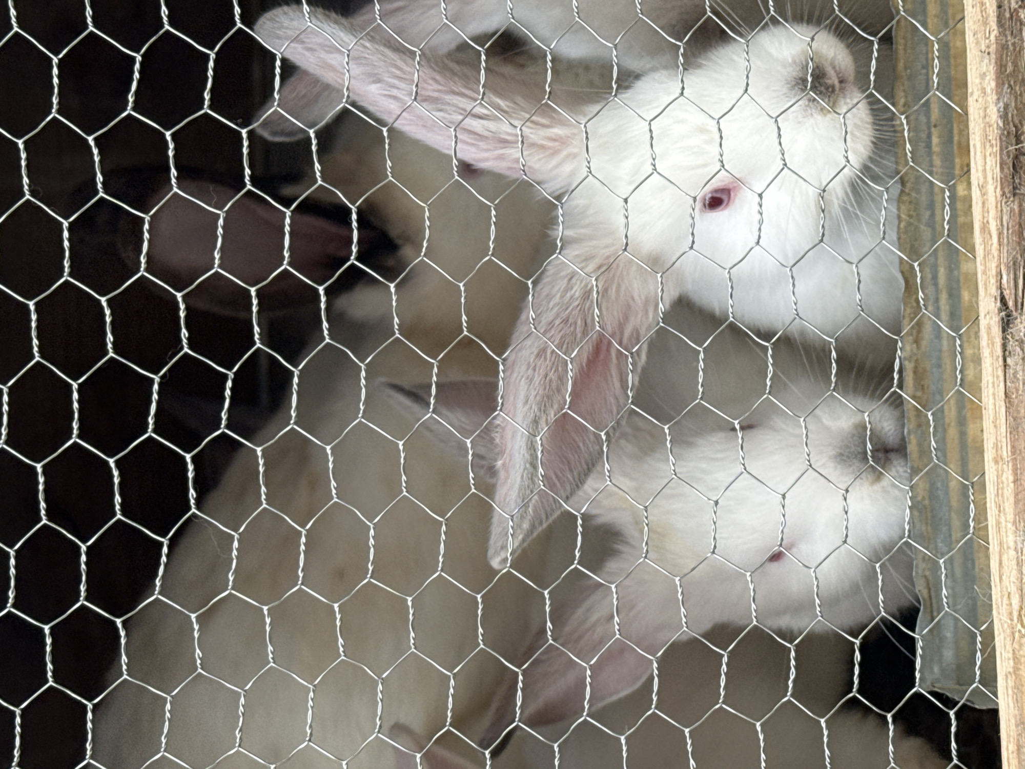 two white rabbits in a cage made of chicken wire