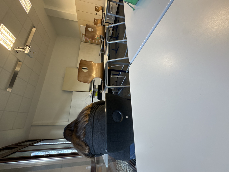The image depicts an indoor educational setting, identified as being in Bühl, Germany, specifically a classroom or lecture hall, viewed from a low perspective, likely from an unoccupied desk in the foreground. In the foreground-middle, a person is seated with their back to the camera. They have long, dark brown hair and are wearing a dark grey or black jacket over what appears to be blue jeans. They are seated in a dark chair with a circular cutout in the backrest, positioned at a light-colored rectangular desk. Their posture suggests they are focused on an activity at the desk or an area beyond it. Immediately to the right of the camera's perspective, a second light-colored rectangular desk is partially visible, on which a small green pouch is placed. Beyond the seated individual, several rows of additional desks and chairs are arranged. These chairs feature light-colored wooden, curved backrests with a distinctive oval cutout, mounted on grey metal frames. The desks are also light-colored with grey metal frames. Along the left side of the room, a large window with dark frames extends upwards, admitting natural light. Outside the window, at desk level, a shallow area filled with small white and grey stones is visible. The ceiling is composed of light-colored tiles, incorporating multiple rectangular fluorescent light panels and a white projector unit mounted from the ceiling. A large white board or projection screen is visible on the far wall of the room. The overall environment is well-lit by a combination of natural and artificial light.