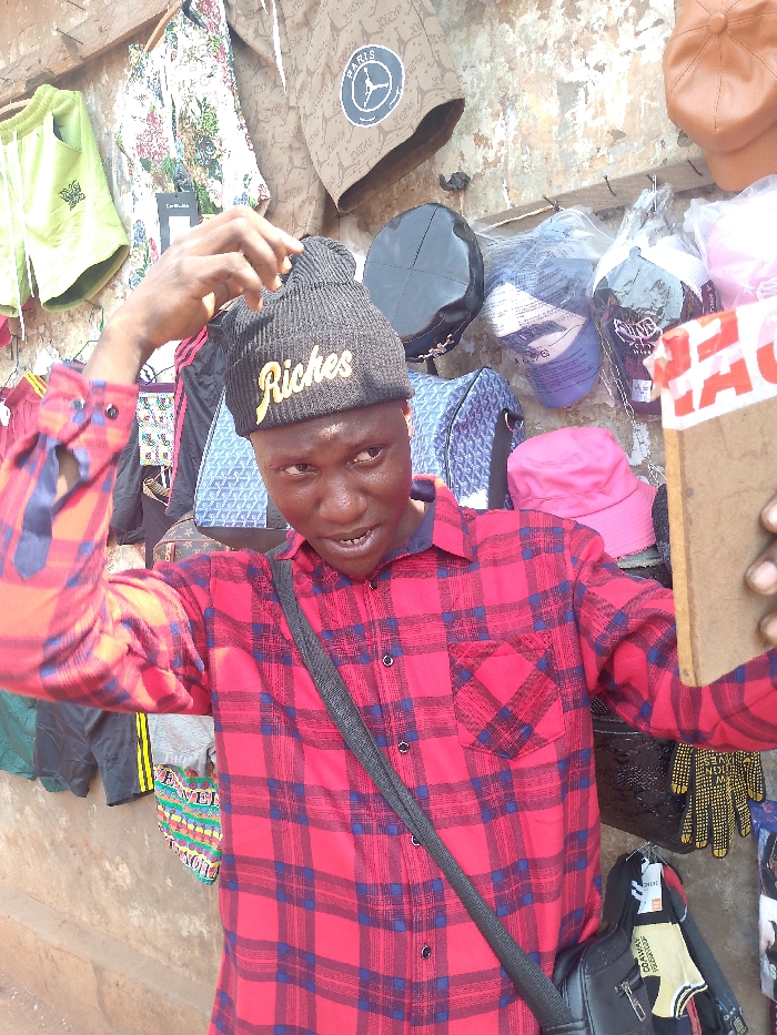 A man in a red and blue plaid shirt and a black "Riches" beanie stands in front of a vendor's stall. Hanging behind him are various clothing items like shorts, pants, and hats. There are other items, including bags and gloves, also on display. The man has one hand on his head near the beanie and holds a small box in his other hand. He also has a black bag hanging across his body. The background is a weathered wall and various hanging merchandise.