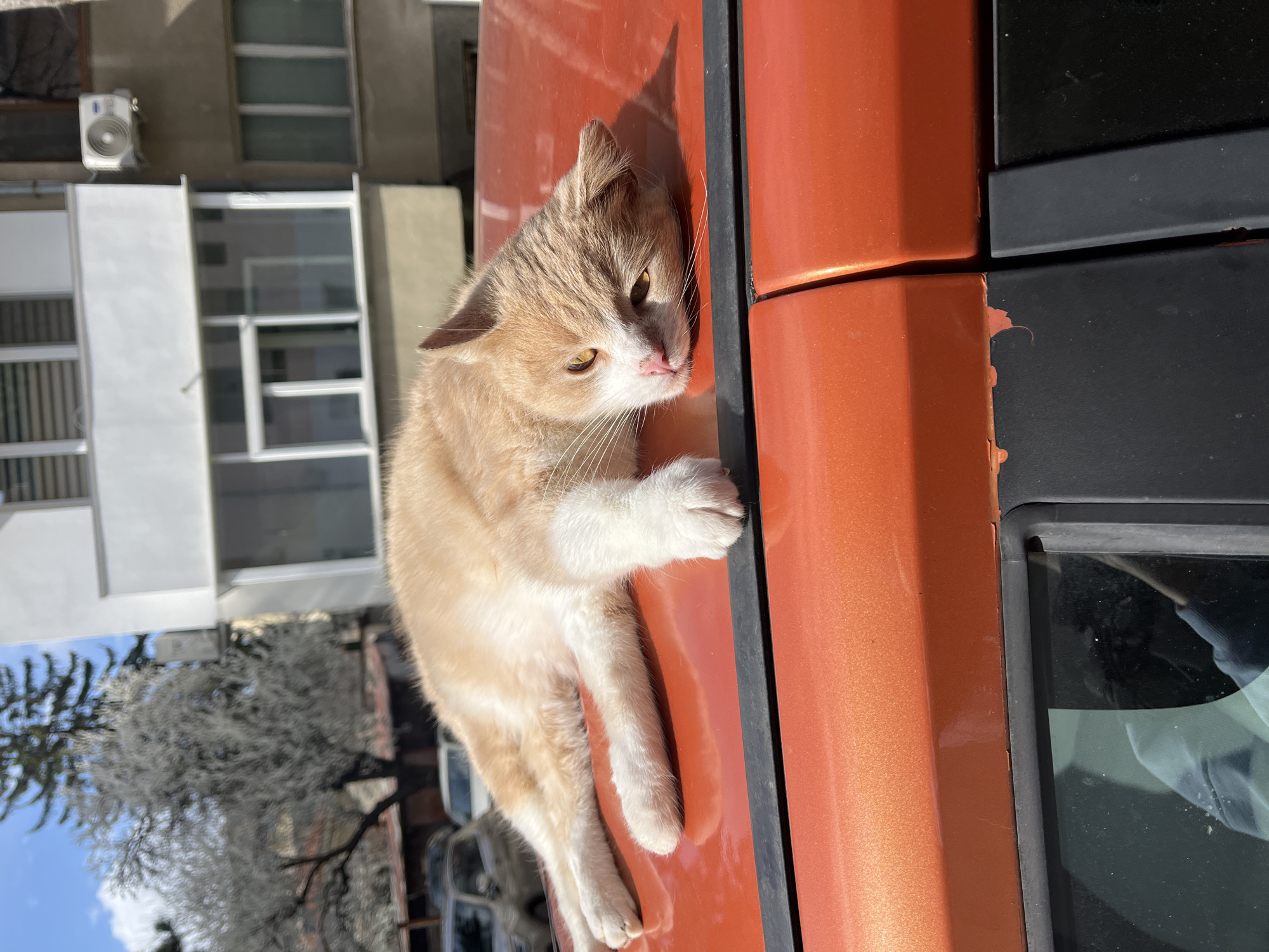 A medium shot shows a cat lying on an orange vehicle. The cat is light orange with white legs and paws, with its head facing toward the top right. The background shows several buildings, along with trees and a blue sky. The photograph was taken during the day and the cat is in direct sunlight. The location is Dobrich, Bulgaria.