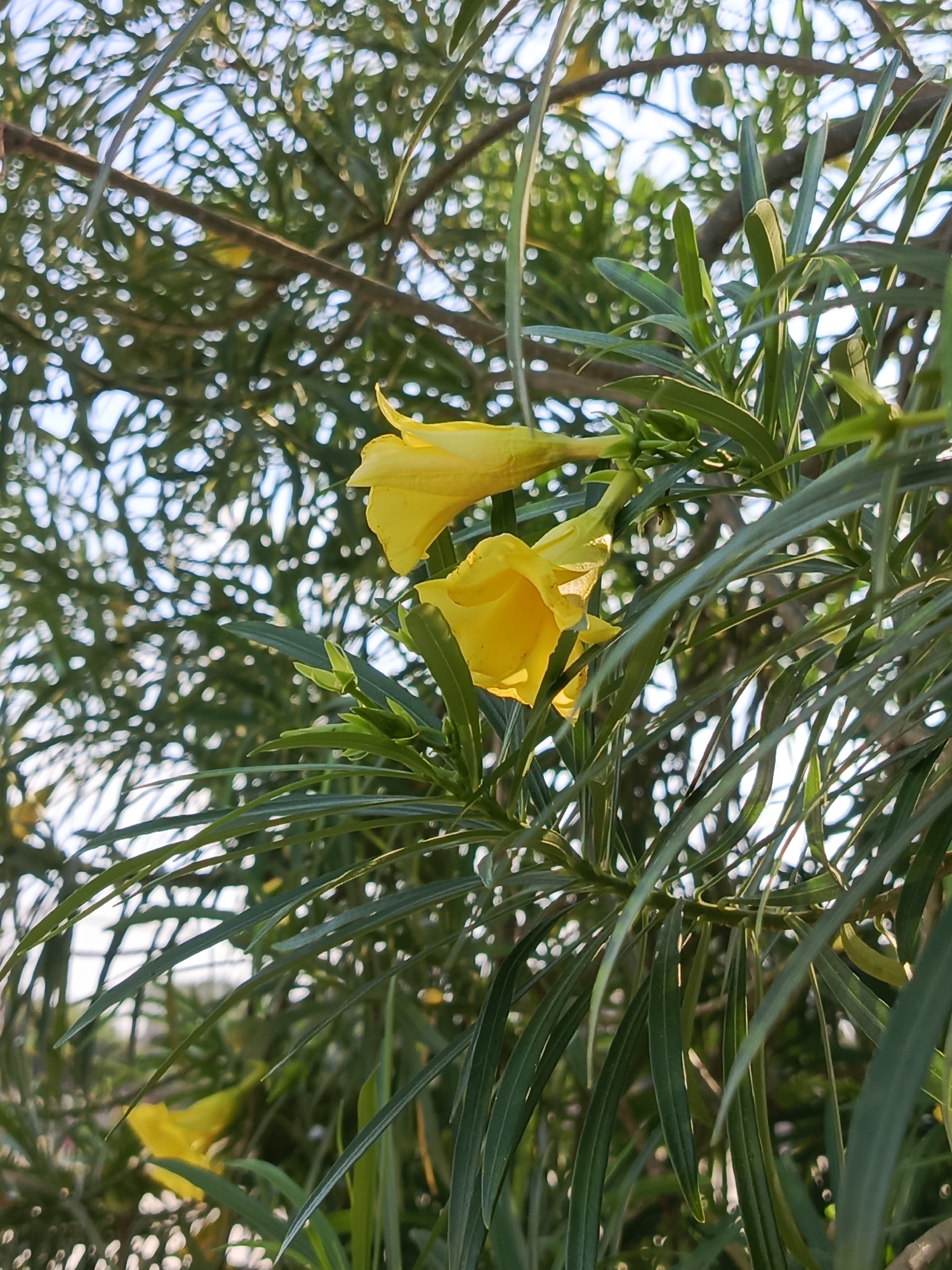 - "A close-up photograph captures two yellow, trumpet-shaped flowers, consistent with *Thevetia peruviana*, in bloom on a plant" by FM-WXIIo1, licensed under CC BY 4.0