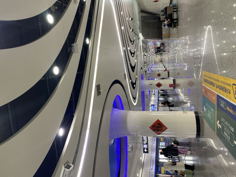 An indoor space with a modern design featuring a curved, white ceiling with embedded lighting. Rows of white pillars with red decorative squares line a corridor where people are walking with luggage. Blue light accents are incorporated into the pillars. Floor signage indicates directions. The space appears to be an airport or train station terminal.