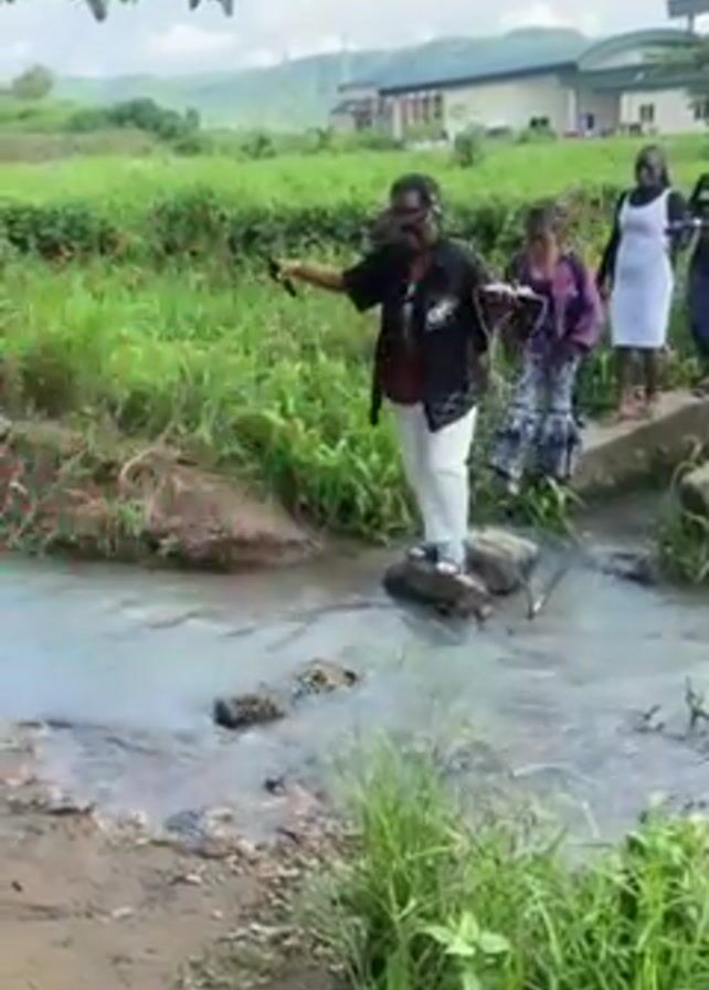 group of people crossing a small stream by stepping on a series of rocks. The stream is surrounded by green vegetation. A building is visible in the background. The people take turns using the rocks to cross. One person uses a stick for balance. The water in the stream appears murky.