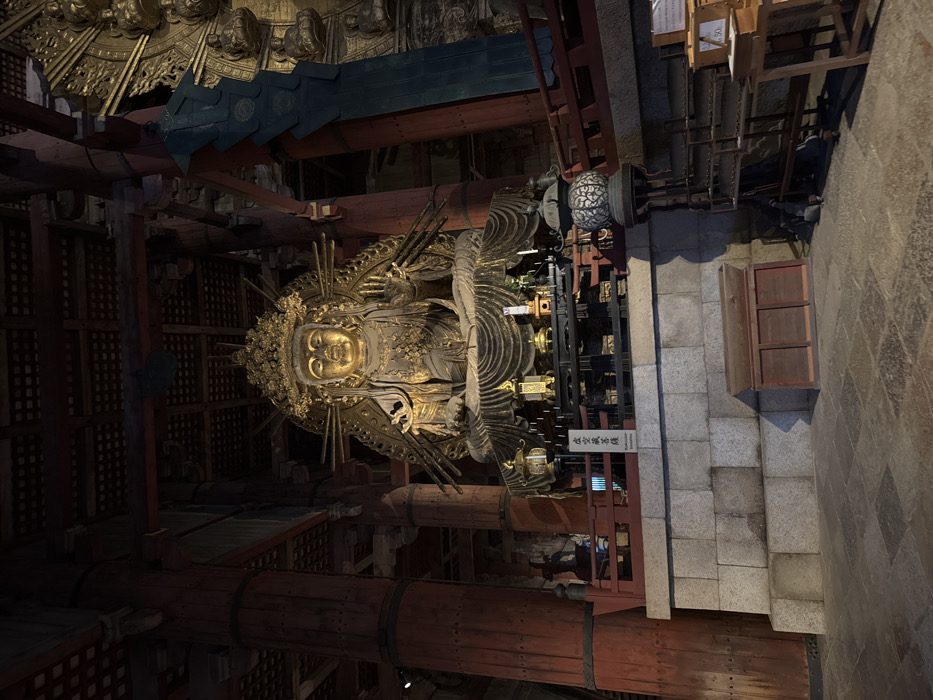This image captures the gilded statue of Kokūzō Bosatsu (虚空蔵菩薩) situated within the Daibutsu-den (Great Buddha Hall) of Todai-ji Temple in Nara, Japan