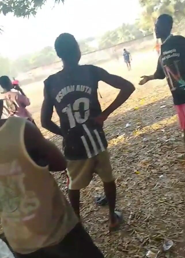 The video depicts a group of young people gathered in a field. Some of them are watching a soccer game in the distance. The person closest to the camera is wearing a tank top, while another wears a black and white jersey with the name "USMAN AUTA" and the number 10. The ground is covered with fallen leaves and debris. The weather appears sunny.