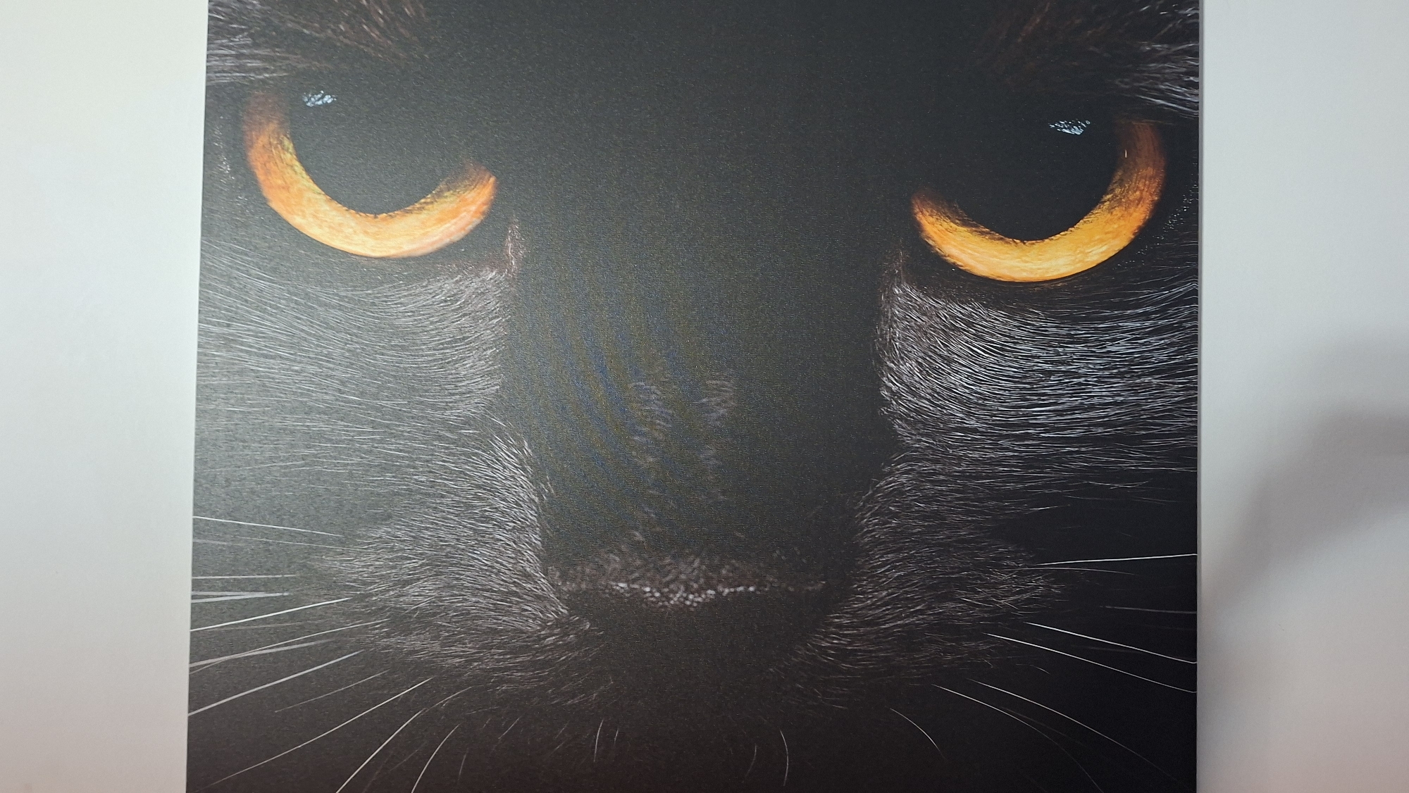 A photographic print or digital display, framed by white borders, presents a forensic, head-on close-up of a black cat's face