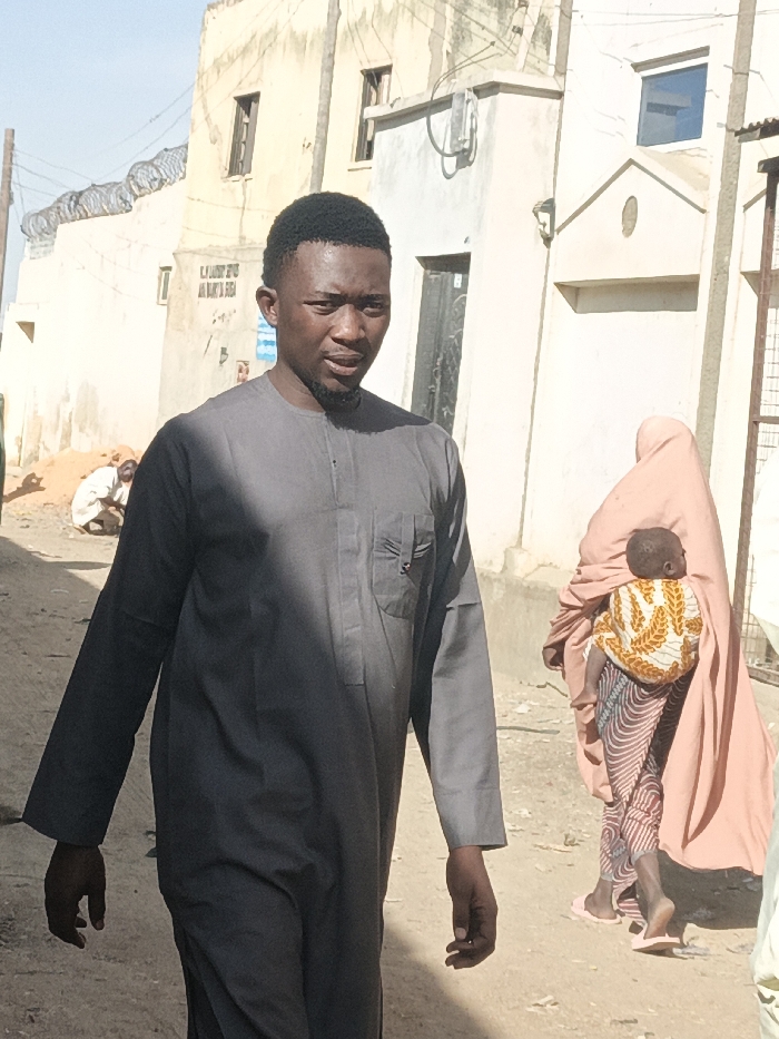 A man in a gray tunic walks toward the viewer. Behind him, a woman wearing a light pink hijab carries a child strapped to her back with a patterned cloth. In the background, buildings with visible windows and an air conditioning unit are seen. A man sits in the distance, possibly working. The scene appears to be a street or alleyway in a warm climate.