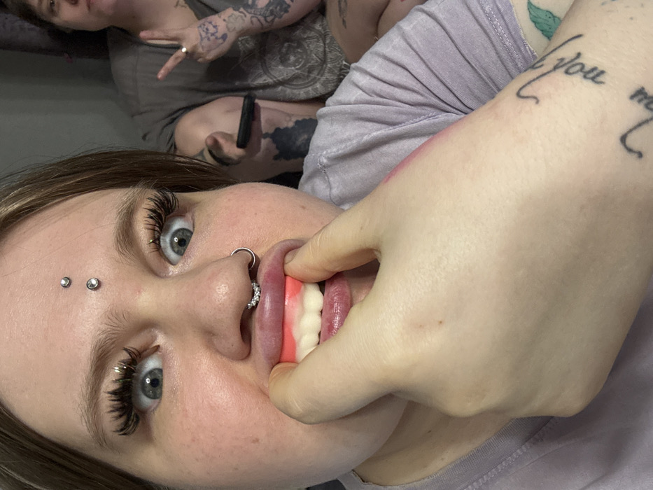 The image captures an indoor scene in Saratov, Russia, featuring two individuals. In the immediate foreground, a close-up frontal view of an adult female's face dominates the frame. She stares directly into the camera with wide, light-colored eyes enhanced by prominent, dark false eyelashes. Her forehead displays two dermal piercings, each with a silver-colored stud. Her nose is adorned with a jeweled circular septum ring and a plain silver-colored hoop on the right nostril. Her mouth is open, and she is actively inserting or holding a set of novelty false teeth, comprising pink "gums" and white "teeth," with the thumb and index finger of her left hand, which pushes her lower lip outward. The back of her left hand and forearm reveal a faded script tattoo. She wears a light-colored, short-sleeved garment. Positioned behind and to the right of the foreground subject, a second adult individual is partially visible, appearing seated. This individual has dark, short hair and is looking slightly away from the camera. They wear a dark-colored, short-sleeved t-shirt featuring a subtle circular design on the chest. Their left arm exhibits extensive dark tattoos and holds a dark, rectangular electronic device. Their right hand is raised, forming a "V" gesture with the index and middle fingers, and a light-colored ring is visible on the ring finger. Additional tattoos are present on their right forearm. The background is blurred, indicating a shallow depth of field, and appears to be a dimly lit interior space, with a dark fabric or curtain visible in the upper right.