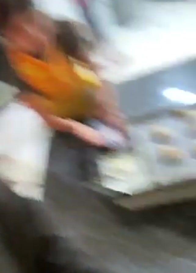 A young man is filming a video of himself. He pans the camera towards a young girl, approximately five years old, standing near a kitchen counter wearing a yellow and orange apron. A baking sheet with nine small yellow balls, likely dough, sits on the counter. The kitchen features light-colored cabinets, white walls, and a marbled gray and black countertop. The young man then refocuses the camera back on himself.