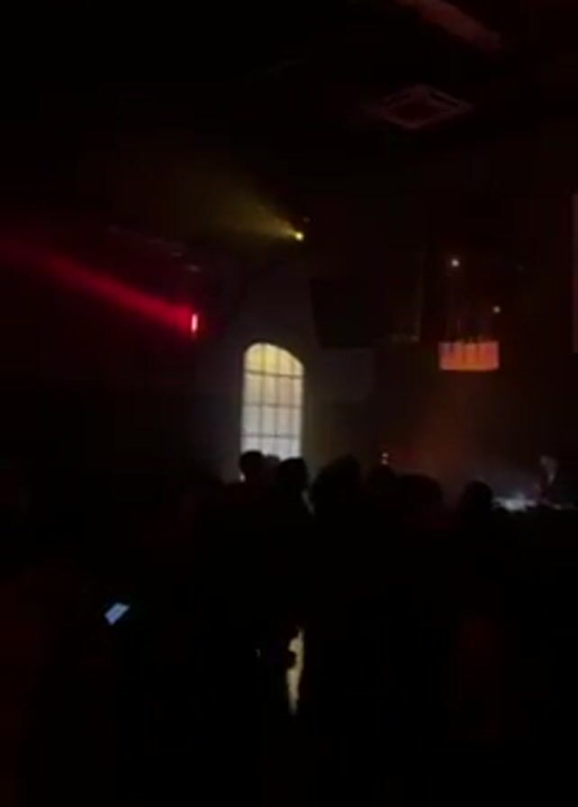 The scene is a dimly lit, large interior space filled with a crowd of silhouetted people. A single figure is visible in front of them, illuminated by spotlights; this person appears to be a DJ or performer standing behind a sound mixing table. The venue has high ceilings and a tall, arched window toward the back. Decorative structures covered in fabric hang from the ceiling, and lighting effects in shades of red and yellow create a dynamic atmosphere. The audience is predominantly dark, but some individuals are holding up phones, presumably to record or photograph the performance. Overall, the environment suggests a concert or a club with a live music performance.