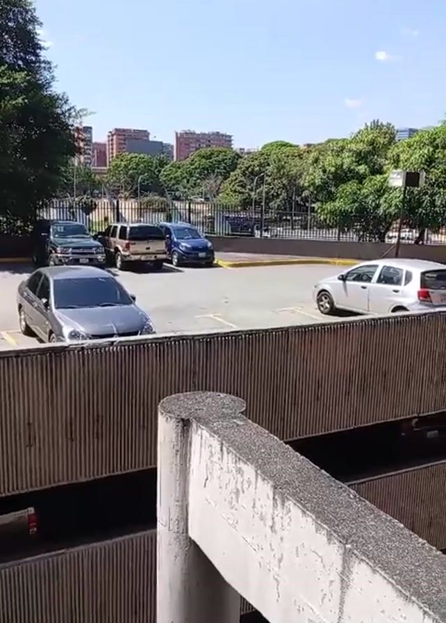 parking area on a sunny day. Several cars are parked in the lot, including a silver sedan, a white hatchback, and a few pickup trucks. The camera pans to follow the white hatchback as it drives through the lot. The parking area is surrounded by trees and buildings. A mountain can be seen in the distance. A multi-level concrete structure with ribbed walls is in the foreground of the camera.