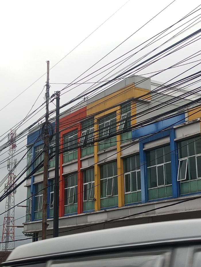 The scene depicts an urban street view in Mandandawela, Sri Lanka, under an overcast sky. A multi-story building dominates the midground, featuring a facade with alternating vertical sections of blue, red, and yellow. Numerous rectangular windows with white frames and green-tinted glass are visible across at least two floors, several of which are partially open, tilting outwards. A dense network of black electrical or communication wires spans horizontally and diagonally across the upper and middle portions of the image, partially obscuring the building and the sky. Two utility poles, one thick and dark, the other thinner and lighter, stand in the left-center, heavily laden with these wires. In the distant background on the far left, a tall, red and white lattice communication tower is visible. The top of a silver or grey vehicle occupies the bottom quarter of the frame, suggesting the photo was taken from or over a vehicle. No individuals or specific actions are depicted.