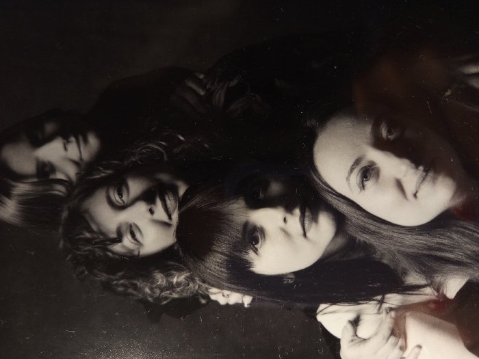 This black and white studio portrait depicts four adult females positioned in a vertically stacked arrangement against a uniformly dark background