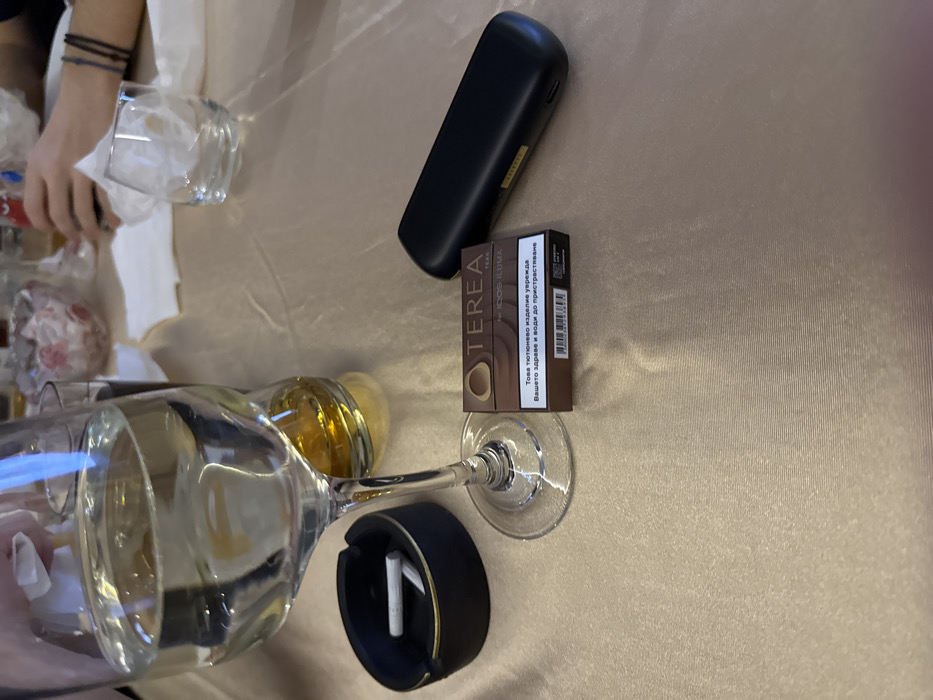 The image displays a close-up, elevated view of a section of a table at an indoor gathering in Plovdiv, Bulgaria. In the foreground, a clear stemmed glass containing white wine is centrally positioned. To its immediate left, a black circular ashtray with a gold interior rim holds a single white cigarette butt. Directly to the right of the wine glass's base, a brown rectangular pack of "TEREA for IQOS ILUMA" heatsticks is visible, featuring Bulgarian warning text on its lower portion. Adjacent to the TEREA pack, a black IQOS ILUMA device rests horizontally. Partially obscured behind the wine glass is another glass containing an amber liquid. The table is covered with a light-colored, possibly beige or champagne, tablecloth. In the upper right quadrant of the image, the hands and forearms of at least two individuals are visible, indicating other persons at the table. One hand holds a dark glass or bottle. An empty, short, clear glass containing a crumpled white napkin is also present in the background. The scene suggests a social event where alcoholic beverages and tobacco products are being consumed.