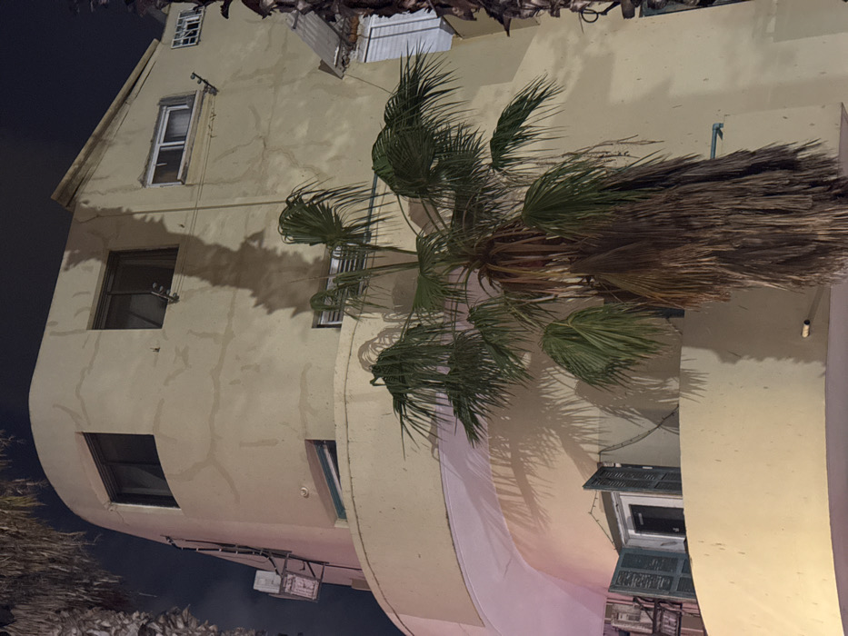 This forensic description details a night scene in Tel-Aviv, Israel, focusing on a multi-story building and surrounding vegetation. The primary subject is a building with a light beige or pale yellow stucco facade, featuring a distinctive curved section on its lower visible floors. The facade displays signs of weathering and hairline cracks. On the upper visible floors, two rectangular windows are visible on the curved section, one featuring internal drapes. To the right, another window with horizontal blinds and a smaller, barred window are present. An external air conditioning condenser unit is mounted on the building's left side. Below the upper windows, a curved balcony or architectural overhang is illuminated from beneath with a faint pinkish-purple light. On the lowest visible floor, a window is open, revealing dark green or blue-green louvered shutters folded back against the wall. A small, circular light fixture is mounted on the curved facade segment below the upper windows. Centrally positioned in front of the building is a large palm tree, obscuring parts of the lower and middle sections. The palm tree exhibits healthy green fronds at its crown, while numerous dried, brown fronds hang downwards, forming a dense skirt around the trunk. Distinct shadows of the palm tree's fronds are cast onto the building's facade by an external light source, creating intricate patterns. A second, partially visible palm tree trunk is present on the far right of the frame. No individuals or active interactions are observed within the scene. The sky is dark, indicating nighttime conditions.