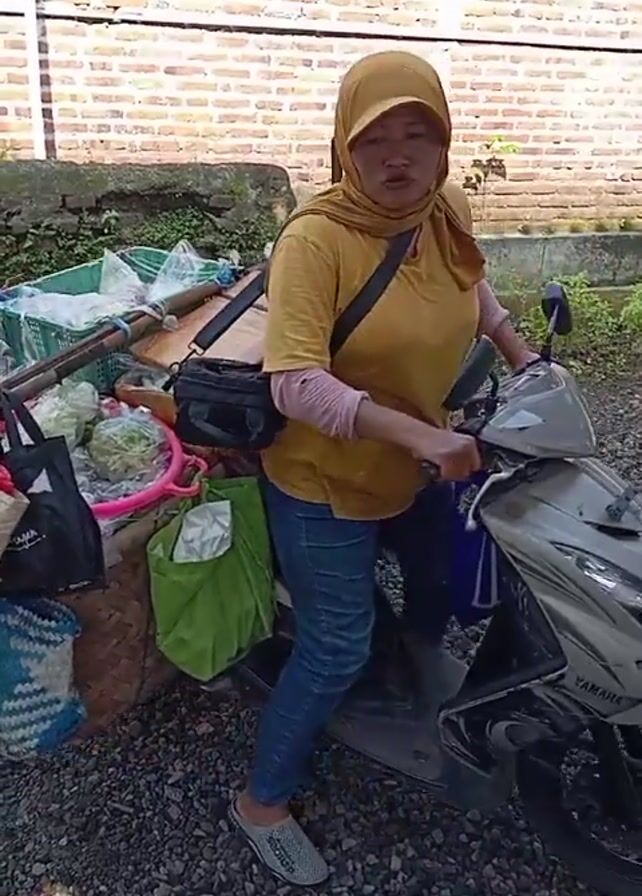 woman standing next to a silver Yamaha scooter loaded with bags and baskets. The scooter is parked on a gravel surface near a brick wall. The woman is wearing a yellow t-shirt, blue jeans, a headscarf, and gray shoes. She is also wearing a black shoulder bag. She is looking at the camera and talking. The scooter is loaded with various items, including what appear to be vegetables. The background consists of a brick wall, some greenery, and a glimpse of what appears to be a building. The lighting suggests it is daytime.