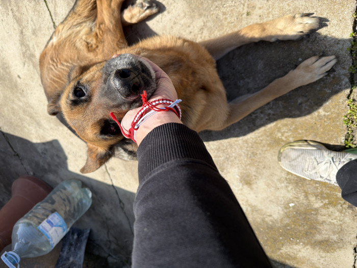 An overhead view depicts a tan and brown mixed-breed dog lying on a concrete surface, head tilted upwards as a human hand pets its chin and neck. The human hand, extended from a black long-sleeved garment, wears multiple red and white string bracelets, commonly known as Martenitsi. The dog's body casts a distinct shadow on the sunlit concrete. In the bottom right, a human foot wearing a white and grey athletic shoe with green accents is visible. The immediate environment includes a clear plastic bottle lying on its side and a partial terracotta-colored pot in the bottom left, with small patches of green vegetation visible along the edge of the concrete surface. The scene is located outdoors in the city of Rupkite, Bulgaria, under bright sunlight.