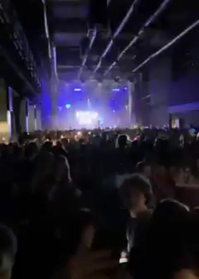 A crowd of people, illuminated by cell phones, is facing a stage. The stage is brightly lit with blue and white lights and smoke. The words “FRANK CARTER” are visible in white letters on a black background on the stage. The ceiling is high and exposes pipes and beams.