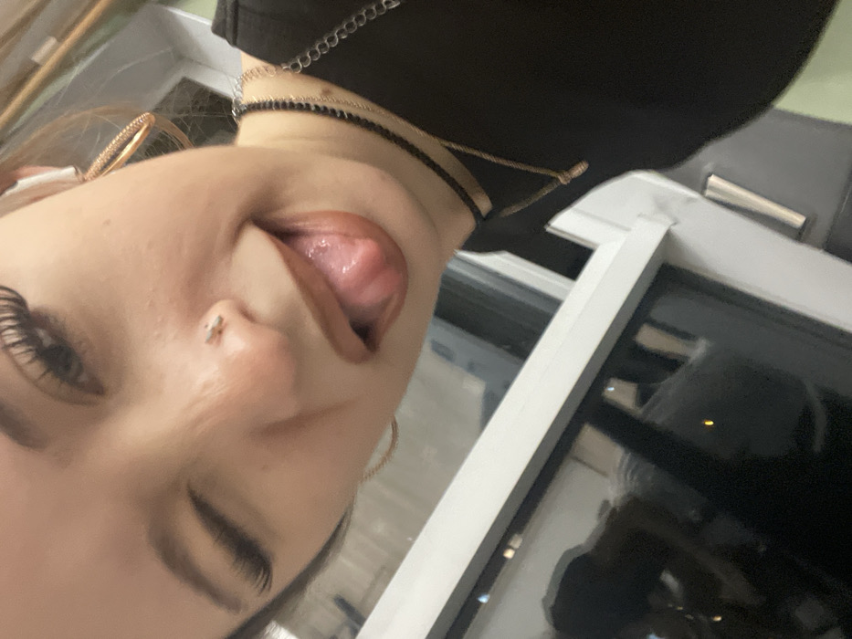 A woman's face fills the frame in a close-up selfie, her head tilted back. Her mouth is open, tongue extended. She has long eyelashes and a nose piercing. She is wearing a black top and a layered necklace. A window frame and reflected cityscape can be seen in the background.