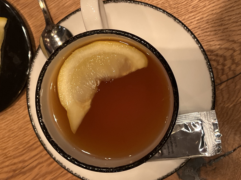 The scene depicts a close-up, overhead view of a beverage setting located in Budapest, Hungary. A white ceramic teacup, featuring a dark, irregularly patterned rim, contains a dark amber liquid consistent with tea. A single crescent-shaped lemon slice floats on the liquid's surface. The teacup rests on a matching white ceramic saucer with a similar dark rim. A silver-colored metal spoon lies on the saucer to the right of the cup. To the left, on the saucer, a small silver foil packet is visible, displaying Hungarian text including "Tápanyagtartalom" (Nutritional content), "Tarolás +25°C" (Storage +25°C), and "Minőségét megőrzi: 06.10.2027" (Best before: October 6, 2027). The cup, saucer, spoon, and packet are positioned on a light brown wooden table with a visible grain pattern. No individuals are present, and no actions or interactions are depicted.