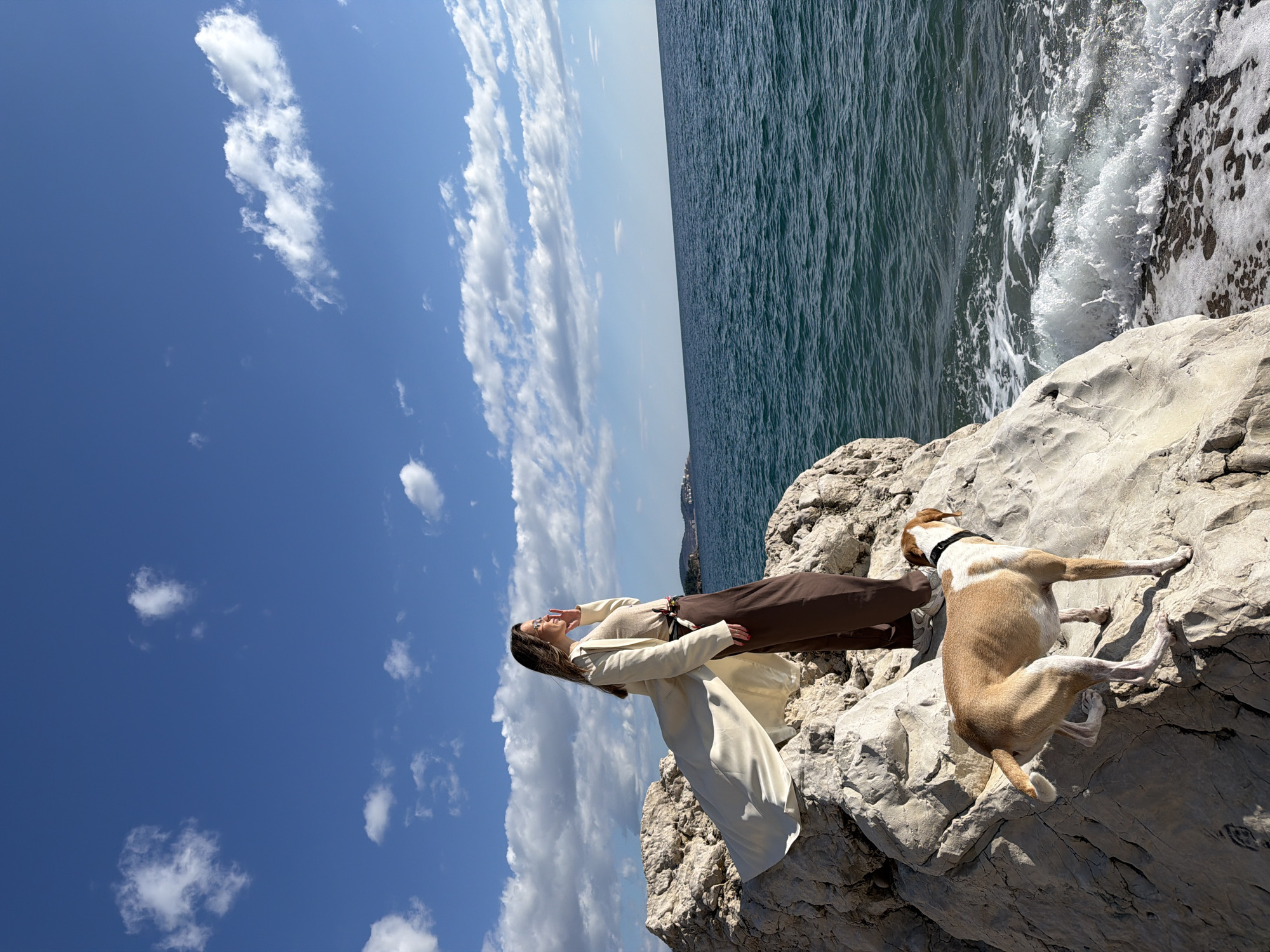 A female individual and a dog are situated on a rocky coastline in Sutomore, Montenegro, under a clear blue sky with scattered white clouds. The woman, with long brown hair, wears a light beige long coat, a beige top, brown wide-leg trousers, and white sneakers. She stands on an elevated light-colored rock, facing towards the right side of the frame, with her right hand near her chin or cheek. Below and slightly behind her, a medium-sized dog with a white and brown coat and a black collar stands on the rugged rocks, also oriented towards the sea. The foreground features prominent light-grey to off-white rock formations. The sea, a deep blue-green, extends to the horizon, with white-capped waves crashing against the shoreline rocks, producing foam. In the distant background to the left, a landmass with visible structures suggests a coastal settlement. Bright sunlight illuminates the scene, casting distinct shadows.