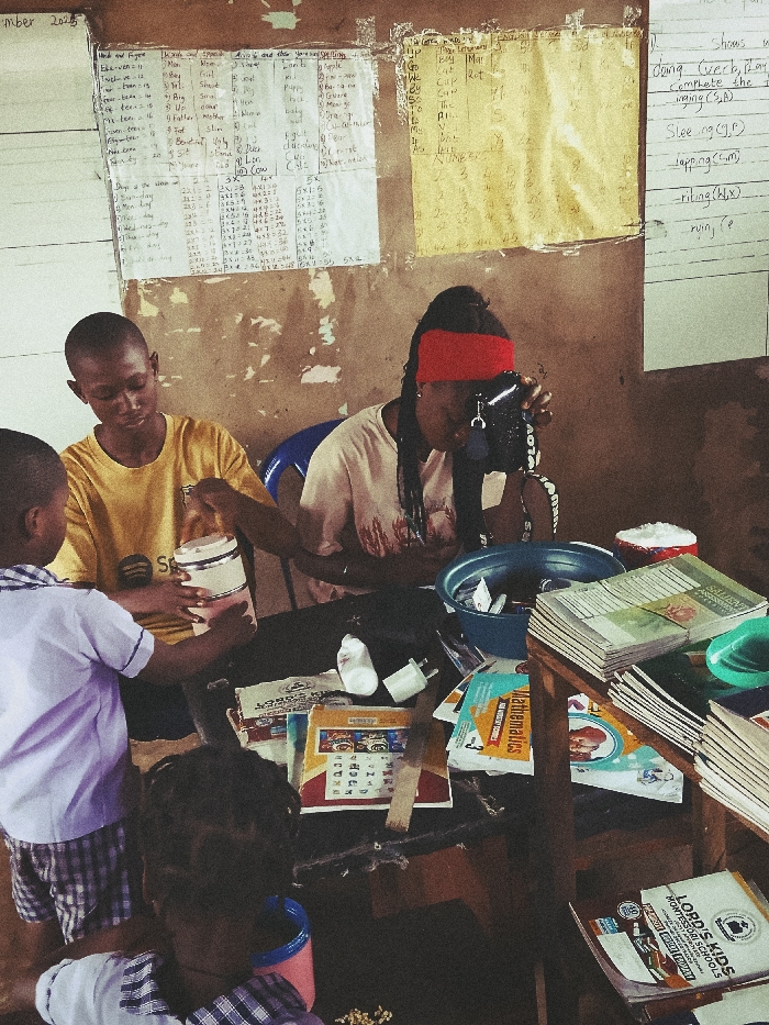 Within an indoor setting in Ukwu-Abwa, Nigeria, likely a classroom or communal learning space, four individuals are present. The room features light brown/beige walls with visible wear, adorned with multiple handwritten educational charts. A young female, wearing a red headband and a light-colored shirt, is seated at a dark table, actively operating a black camera held to her eye. Adjacent to her, a young male in a yellow t-shirt is seated, manipulating a silver and white tiered lunch container. A young child in a white shirt and plaid shorts stands partially visible, facing the male and the container. A second young child, mostly obscured, is near the floor level. The table contains a blue plastic bowl filled with various items, a white power adapter, a white sock, and several textbooks, including one labeled "Mathematics." A stack of books rests on a small wooden stand to the right. A book titled "LORD'S KIDS MONTESSORI SCHOOLS" is visible on the floor alongside scattered light-colored grains and a blue plastic cup.