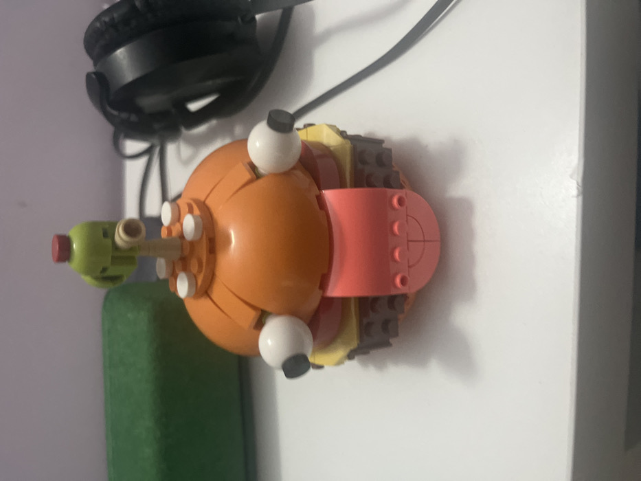 A multi-colored LEGO construction, designed to resemble a cartoon burger character with facial features, is centered on a white, flat, reflective surface. The main body of the figure consists of an orange, segmented dome (top bun), from which two white spherical "eyeballs" with black pupils protrude laterally. A red, flat LEGO piece, shaped like a tongue with a subtle etched smile, extends downwards from the front of the orange dome. On top of the orange dome, a light brown cylindrical piece supports a lime green element capped with a red stud. White circular flat studs adorn the base of the lime green piece on the orange dome. Below the orange dome, layers of yellow and red flat LEGO bricks mimic cheese and tomato, resting on a brown, studded base (bottom bun). In the out-of-focus background to the left, a dark green rectangular object is partially visible. To the right, a pair of black over-ear headphones with intertwined black cables lies on the surface, also out of focus. The scene is illuminated by ambient light. This setup is observed within Gosnells, Australia.
