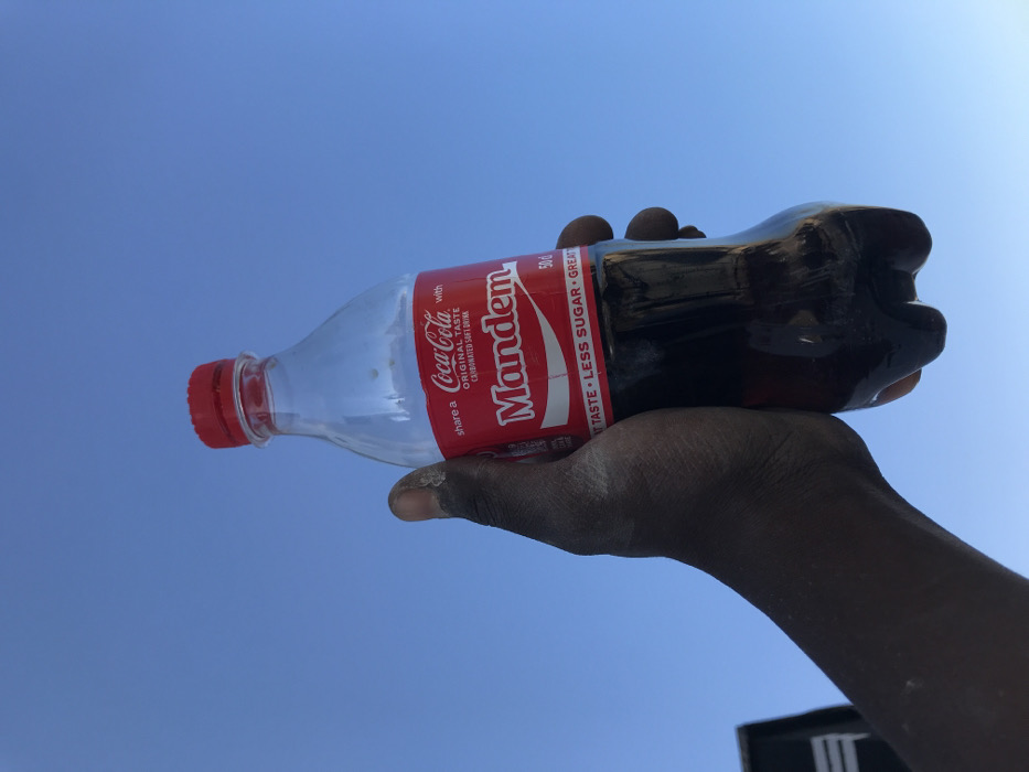 A hand holds a partially empty bottle of Coca-Cola against a clear blue sky. The bottle's label is red and white, featuring the Coca-Cola logo and the word "Mandem." The bottle has a red cap, and some of the cola remains in the bottom half. The person's dark skin contrasts with the bright sky. The cola is described as "ORIGINAL TASTE. LESS SUGAR. GREAT."