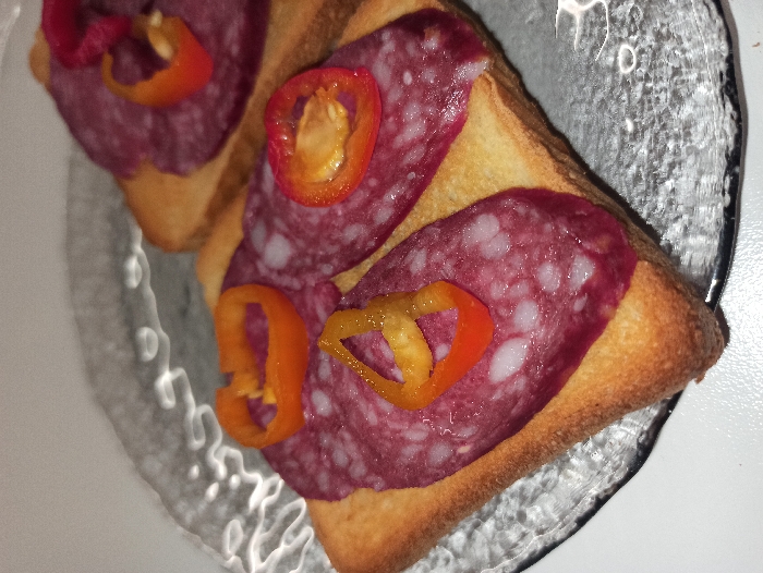 - "Two pieces of toast are topped with salami slices and garnished with rings of orange and yellow peppers" by FM-5QedD3, licensed under CC BY 4.0