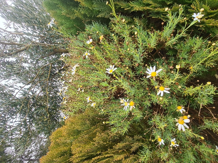 The image captures a vibrant garden scene. Green foliage of varying textures fills the frame, with cypress bushes interspersed with flowering plants, showcasing white daisy-like blooms with yellow centers. An olive tree is visible on the left. The composition suggests a lush, well-maintained landscape bathed in sunlight.