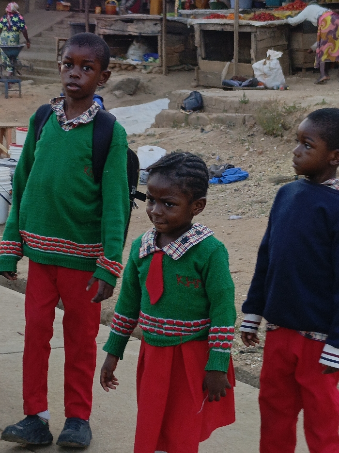 Three African children stand on a dusty road. The child on the left wears a green sweater with red trim and red pants, along with a backpack. The child in the center wears a similar green sweater with a red tie and a red skirt. The child on the right wears a navy blue sweater with red pants. The children appear to be in school uniforms. In the background, stalls or shops can be seen, along with other people.