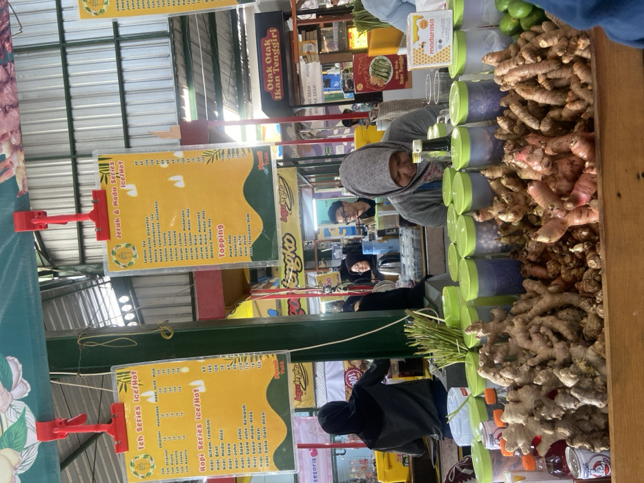 A food stall offers a variety of beverages. Signs advertise "Jeruk & Madu Series" and "Teh Series Ice/Hot" with flavors such as lemon tea, lemongrass, and telang. "Kopi Series Ice/Hot" options include kopi hitam tembok, kopi bear, and kopi jahe, all priced between 6k and 10k. Toppings like madu alas and gula aren are available. Containers of ingredients, including ginger and spices, are displayed alongside a bottle of madurasa. People stand at the stall.