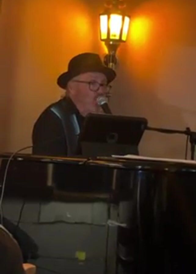 A man in a fedora and glasses is singing into a microphone while playing a black piano. A lit, wall-mounted lantern is visible above his head. He occasionally looks down at a tablet on the piano in front of him. A blurred figure is seen on the lower left of the frame.